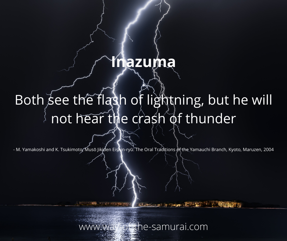 “Makimono serve as a written record of the kata and principles of the ryū. But instruction must come as well, from the teacher himself. This personal aspect of the bugeisha's learning is the kuden, literally the "oral teachings" that cannot be found in any scroll or text. The kata chotan ichimi is a good example of the importance of the kuden as they apply to kenjutsu, the art of the sword. Nothing in the written makimono mentions the significance of the shift in stance at the onset of the kata. The switch, changing from a right leg forward posture to one with the left leg leading and lowering the sword at the same time, seems to be a weakening of the defense that might have been afforded by the kamae, the physical carriage of readiness taken by the swordsman. In a way, I had learned through through Sensei's kuden, there is a weakness of sorts, in the position. kamae, often misunderstood as postures meant to display strength, to make the body impregnable, are often quite often just the opposite. Many kamae are a ruse, a combative invitation, a deliberate attempt to "sucker" an opponent, making him go for an obvious opening offered in your posture.