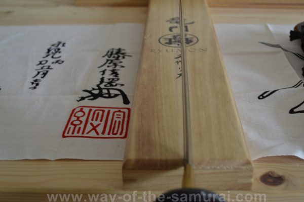 It arrived in a 20x20x 8 brown box, inside of which was a smaller brown box, unsealed and un-taped. Inside was a very nice wooden box with the Ryumon logo on it. In a very nice touch the box has some small shavings tapering the edge.